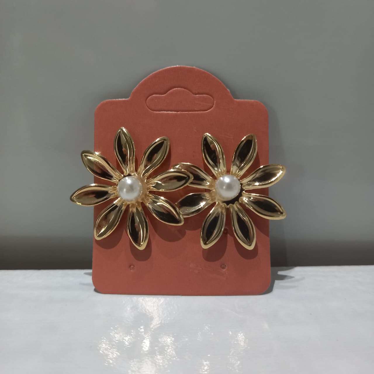 Brinco em formato de flor com uma perola no meio com acabamento dourado - Tamanho P.